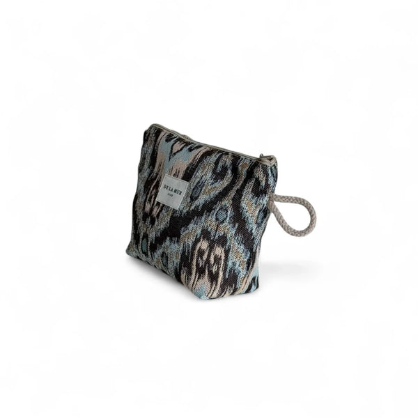 Diese Beauty Bag der La Mur Line, auch Kosmetiktasche oder Make-up-Tasche genannt, ist aus einem dicken Jacquardstoff mit einem grafischen Ikat-Muster in blaugrauen Tönen gefertigt. Das Muster kann je nach Zuschnitt variieren.