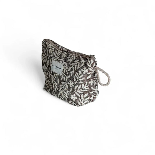 Diese Beauty Bag der La Mur Line, auch Kosmetiktasche oder Make-up-Tasche genannt, ist aus einem dicken Jacquardstoff mit einem cremefarbenen Blumenmuster auf braunem Grund gefertigt. Das Muster kann je nach Zuschnitt variieren.