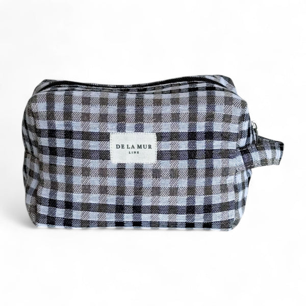 Diese Beauty Bag der La Mur Line, auch Kosmetiktasche oder Make-up-Tasche genannt, ist aus einem dicken Jacquardstoff mit einem Karomuster in Beige- und Schwarztönen gefertigt. Das Muster kann je nach Zuschnitt variieren.