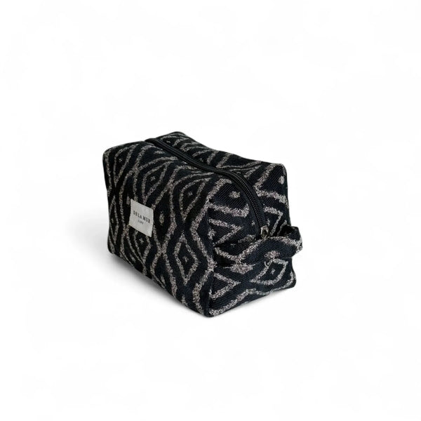 Diese Beauty Bag der La Mur Line, auch Kosmetiktasche oder Make-up-Tasche genannt, ist aus einem dicken Jacquardstoff gefertigt und zeigt ein beiges, grafisches Karomuster auf tiefschwarzem Hintergrund. Das Muster kann je nach Zuschnitt bei jedem Artikel variieren.