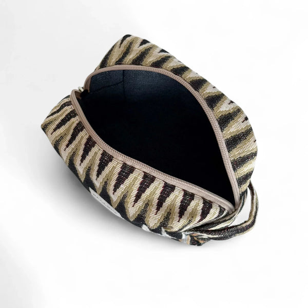 Diese Beauty Bag der La Mur Line, auch Kosmetiktasche oder Make-up-Tasche genannt, ist aus einem dicken Jacquardstoff mit Zickzackmuster in Erdtönen wie Beige, Braun, Sand und Schwarz gefertigt. Das Muster kann je nach Zuschnitt variieren.