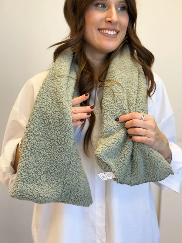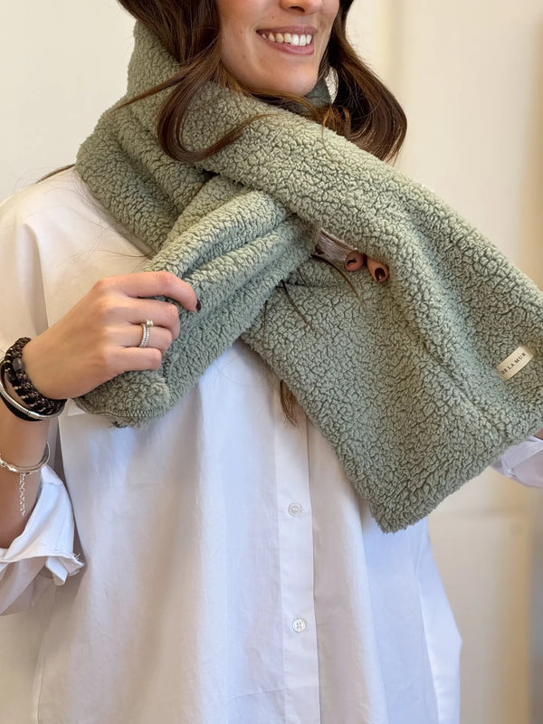 Dieser Schlauchschal von La Mur Line ist aus einem hellgrünen Teddy-Stoff gefertigt.