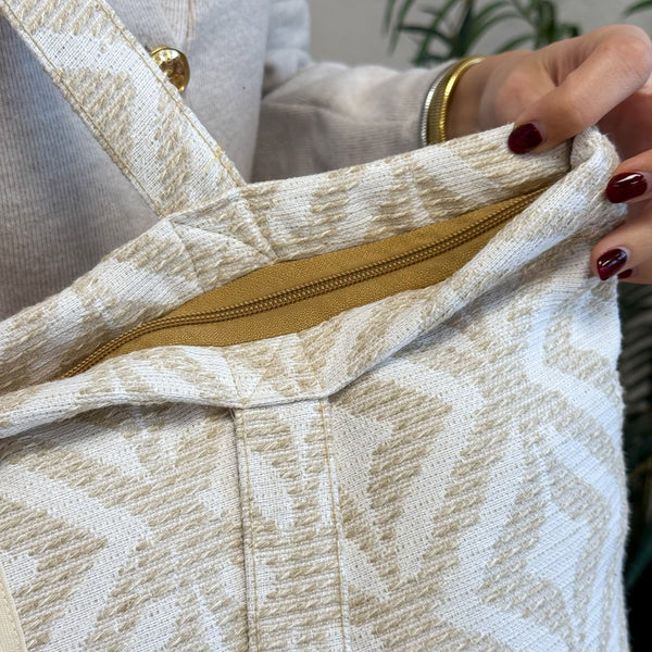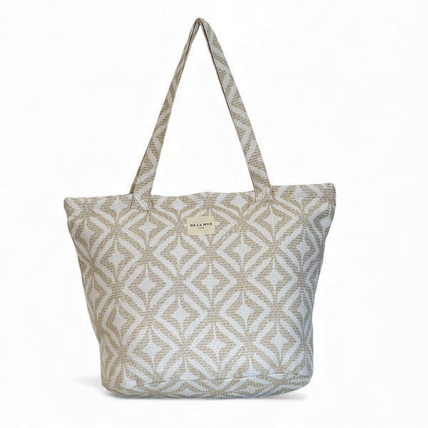 Diese große Einkaufstasche von De La Mur Line ist aus Jacquard-Stoff mit einem raffinierten geometrischen Muster in Sand- und Cremetönen gefertigt.