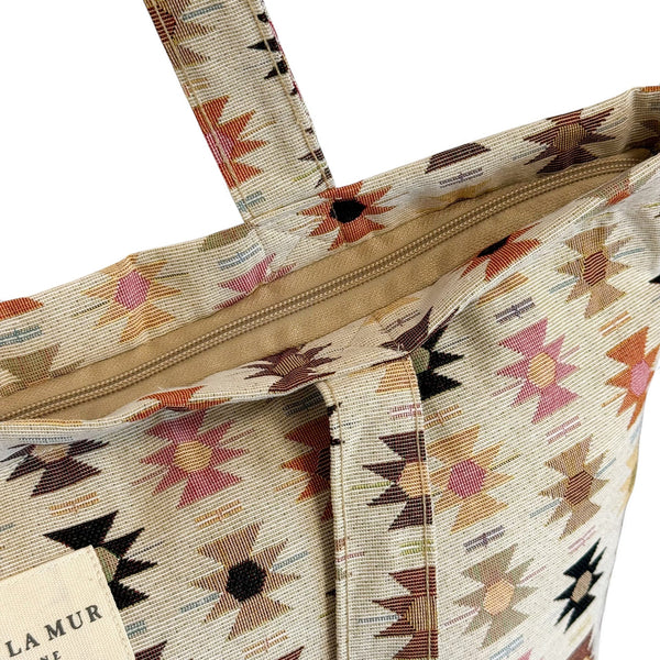 Diese große Einkaufstasche von De La Mur Line ist aus Jacquard-Stoff gefertigt und hat einen geometrischen Druck in Rosa- und Orangetönen auf beigem Hintergrund.
