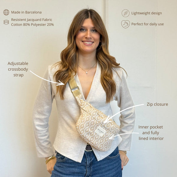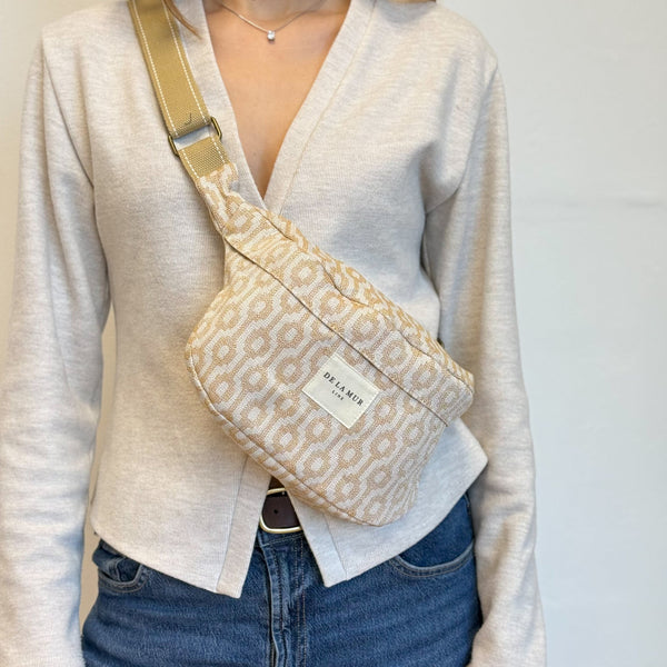 Das Must-have in Ihrer Taschensammlung: die Bauchtasche! Diese trendige Bauchtasche aus der La Mur Linie, auch bekannt als Gürteltasche, ist aus einem kamelfarbenen Jacquard-Stoff mit einem raffinierten cremefarbenen geometrischen Muster gefertigt.