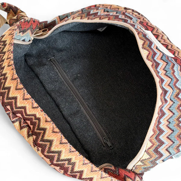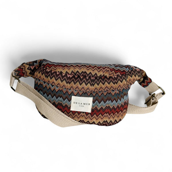 Das absolute Must-have in jeder Taschensammlung: die Gürteltasche! Diese angesagte Gürteltasche von La Mur Line, auch Fanny Pack genannt, ist ausgeführt in einem dicken Jacquardstoff mit einem farbenfrohen Zickzackmuster in warmen Farbtönen wie Rost, Ocker, Altrosa, Blau und Braun.