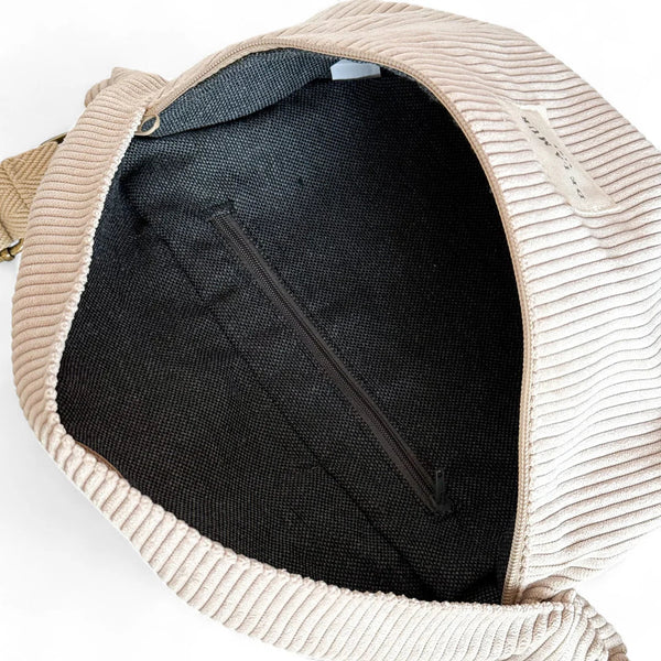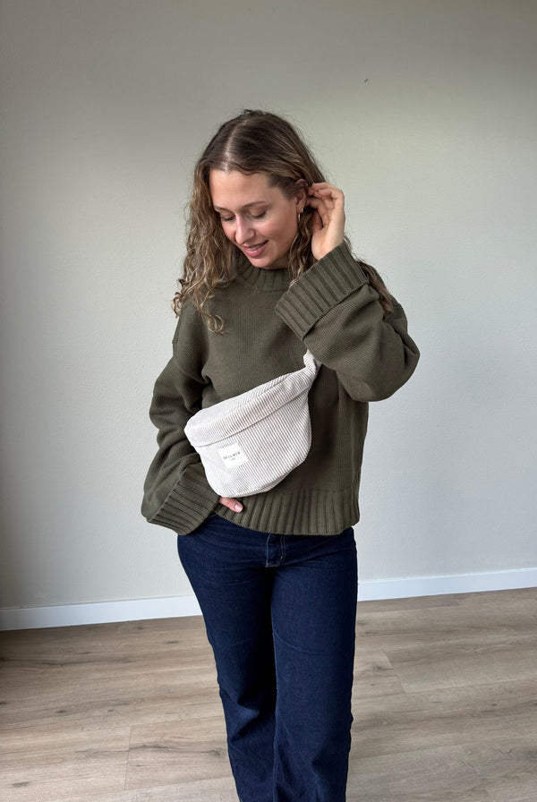 Das absolute Must-have in jeder Taschensammlung: die Gürteltasche! Diese angesagte Gürteltasche von La Mur Line, auch Fanny Pack genannt, ist ausgeführt in einem beigefarbenen Cord-Rippstoff.