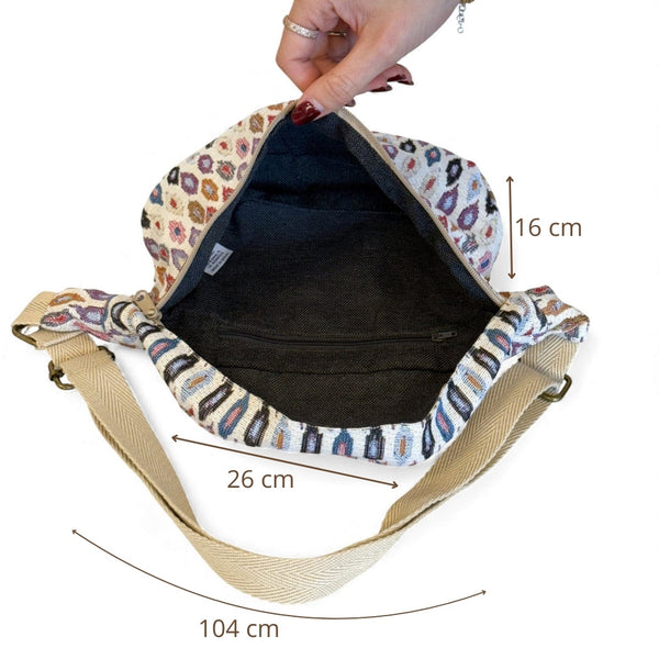 Die Tasche ist gefüttert, hat einen Reißverschluss, einen verstellbaren Schultergurt und ist aus hochwertigem Stoff gefertigt.