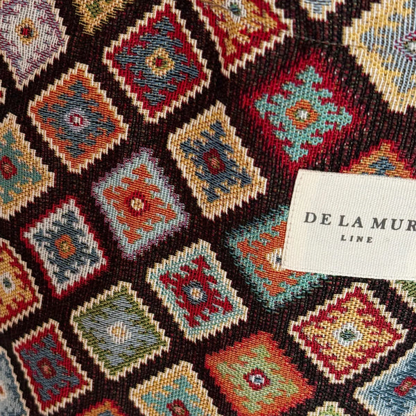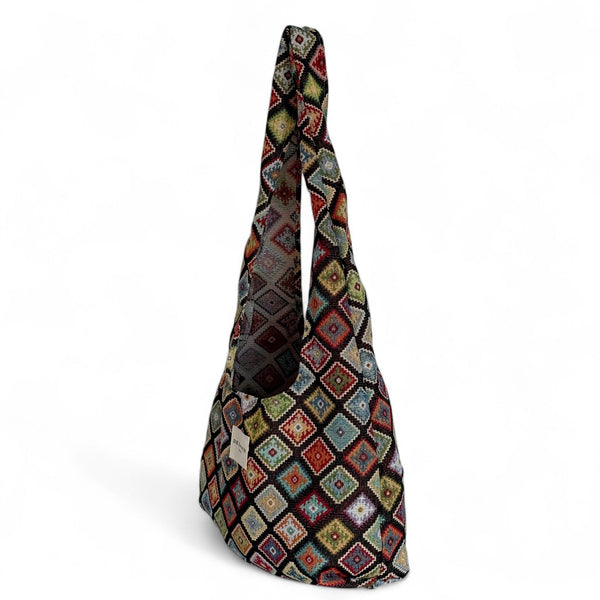 Diese einzigartige ovale Einkaufstasche aus der La Mur Line, auch bekannt als Halbmond-Shopper, ist aus einem dicken Jacquardstoff mit einem farbenfrohen, gehäkelten Muster gefertigt.