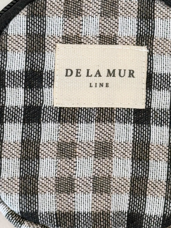 Dieses verspielte, runde Portemonnaie der La Mur Line ist aus einem dicken Jacquardstoff mit einem Karomuster in Beige- und Schwarztönen gefertigt. Jedes Stück kann je nach Zuschnitt im Muster variieren.