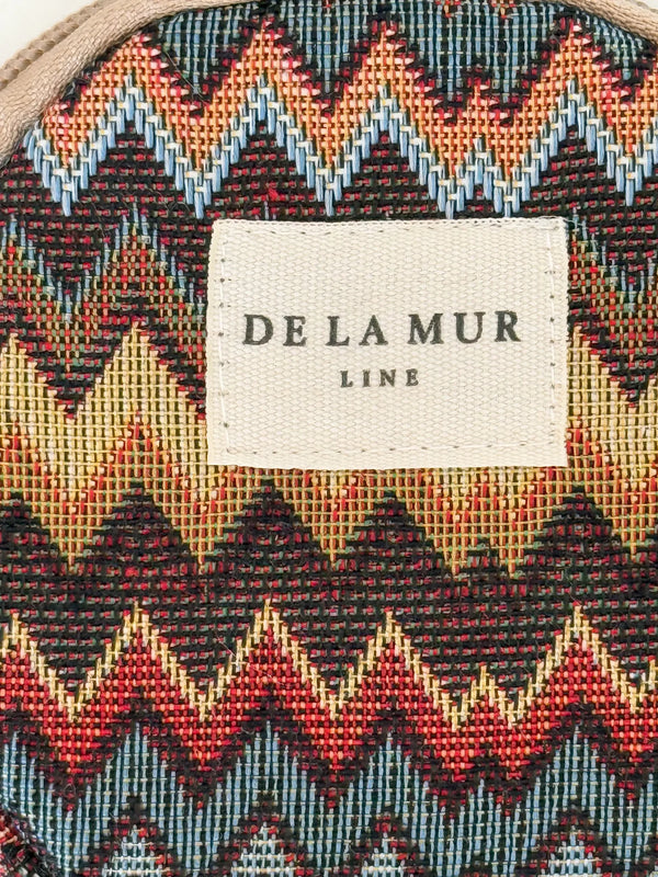 Dieses verspielte, runde Portemonnaie aus der La Mur Line ist aus einem dicken Jacquardstoff mit einem farbenfrohen Zickzackmuster in warmen Farbtönen wie Rost, Ocker, Altrosa, Blau und Braun gefertigt. Jedes Stück kann je nach Zuschnitt im Muster variieren.
