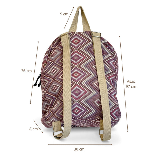 Dieser stylische Rucksack von De La Mur Line ist aus Jacquard-Gewebe mit einem geometrischen Muster in Rosa- und Lilatönen gefertigt.