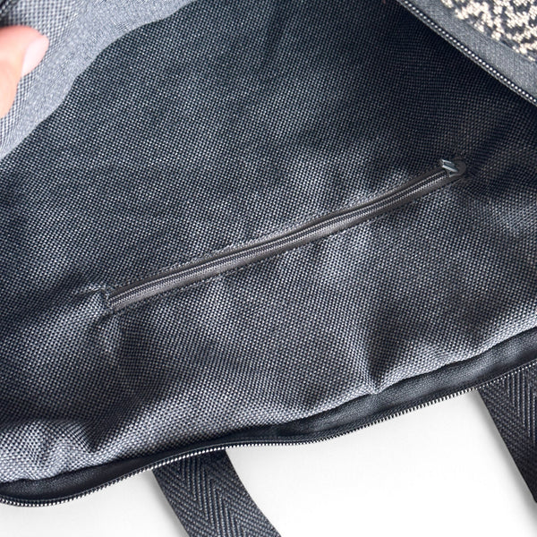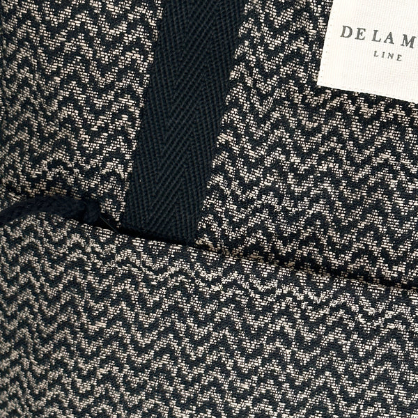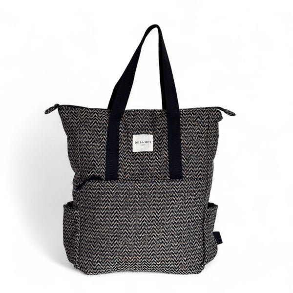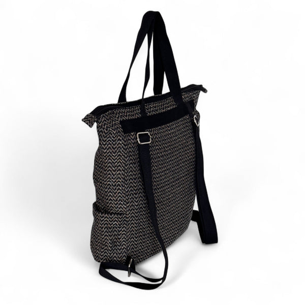 Ein Rucksack-Shopper ist eine stilvolle Mischung aus Rucksack und Einkaufstasche. Dank der kurzen Henkel kann man den Rucksack bequem auf dem Rücken oder elegant in der Hand tragen. Dieser geräumige Rucksack ist aus einem dicken Jacquardstoff mit einem Zickzackmuster in Schwarz und Beige gefertigt.