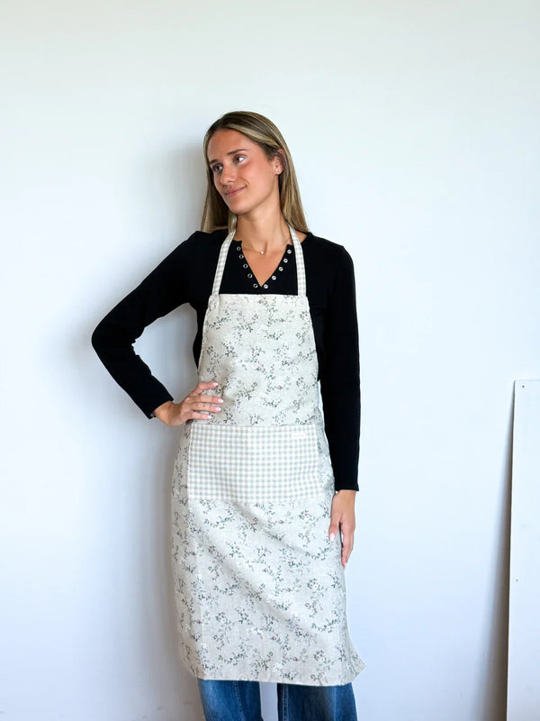 Diese Küchenschürze aus der La Mur Line ist aus einem Halbleinenstoff mit einem Blumenmuster auf grauem Hintergrund gefertigt, kombiniert mit einem Karomuster auf der Vordertasche.