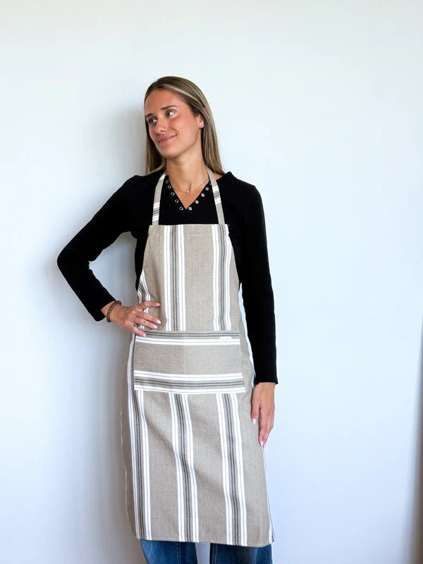 Diese Küchenschürze aus der La Mur Line ist aus einem dicken Stoff mit einem gestreiften Muster in Hellbraun und Weiß gefertigt.