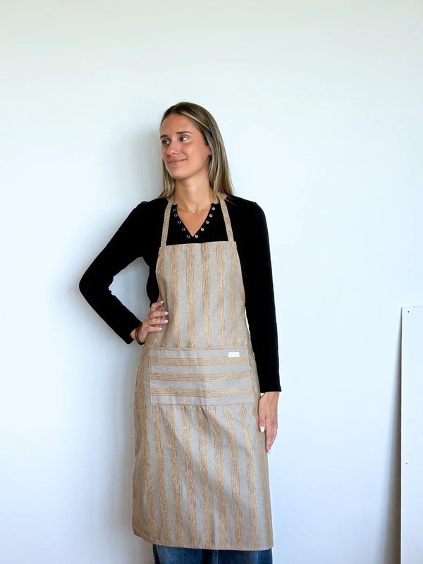 Diese Küchenschürze aus der La Mur Line ist aus einem Chenille-Stoff mit einer juteartigen Struktur und kupferfarbenen Streifen gefertigt.