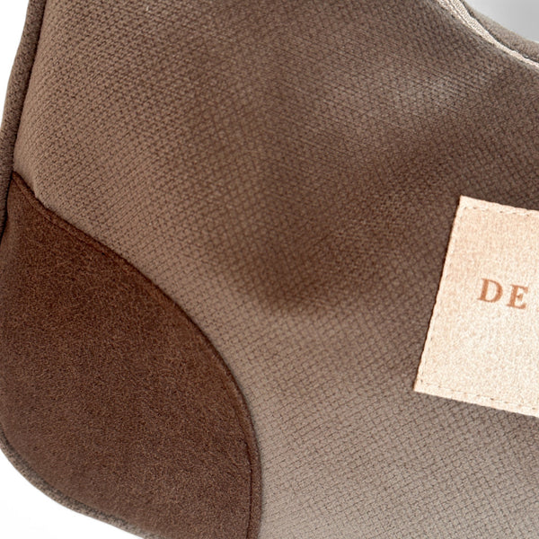 Diese kleine Schultertasche aus der La Mur Line in limitierter Auflage ist aus einem weichen, samtartigen Stoff in einem warmen Taupe-Ton gefertigt, kombiniert mit eleganten Kunstlederakzenten in der gleichen Farbe an den Seiten.