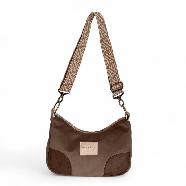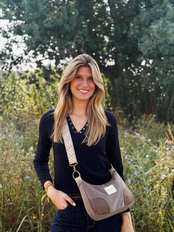 Die Tasche hat einen verstellbaren Schultergurt aus Baumwolle mit einem cremefarbenen und beigefarbenen Muster. Sie können die Tasche bequem als Crossbody-Bag oder lässig über der Schulter tragen – ideal für alltägliche Ausflüge und besondere Anlässe.