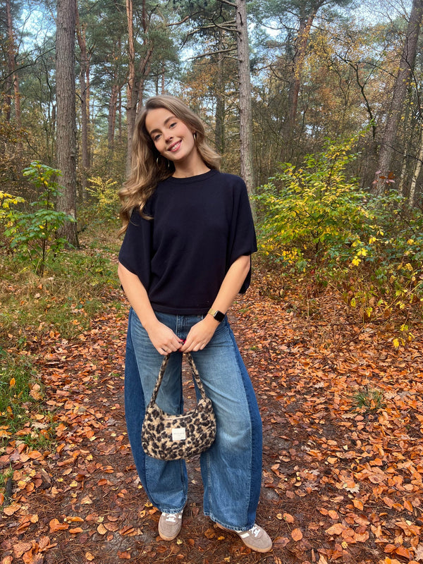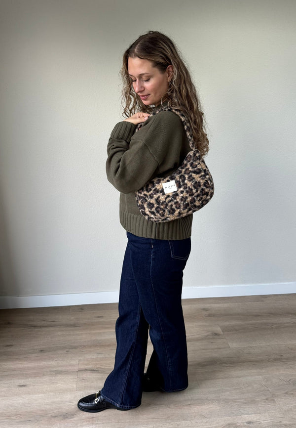 Diese kleine Umhängetasche aus der La Mur Line ist aus einem dicken Teddy-Stoff mit Leopardenmuster gefertigt.