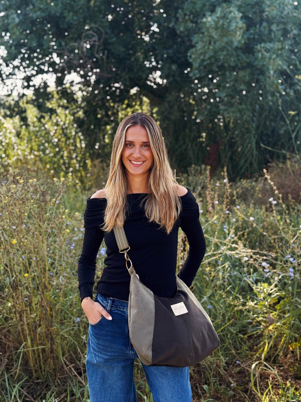 Die Tasche hat einen langen, verstellbaren Schultergurt aus Baumwolle in passendem Khakigrün. Sie können die Tasche bequem quer über den Körper oder lässig über der Schulter tragen – ideal für alltägliche Ausflüge und besondere Anlässe.