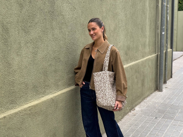Dieser große Shopper von De La Mur Line ist aus einem dicken Jacquardstoff mit einem cremefarbenen Blumenmuster auf braunem Hintergrund gefertigt.