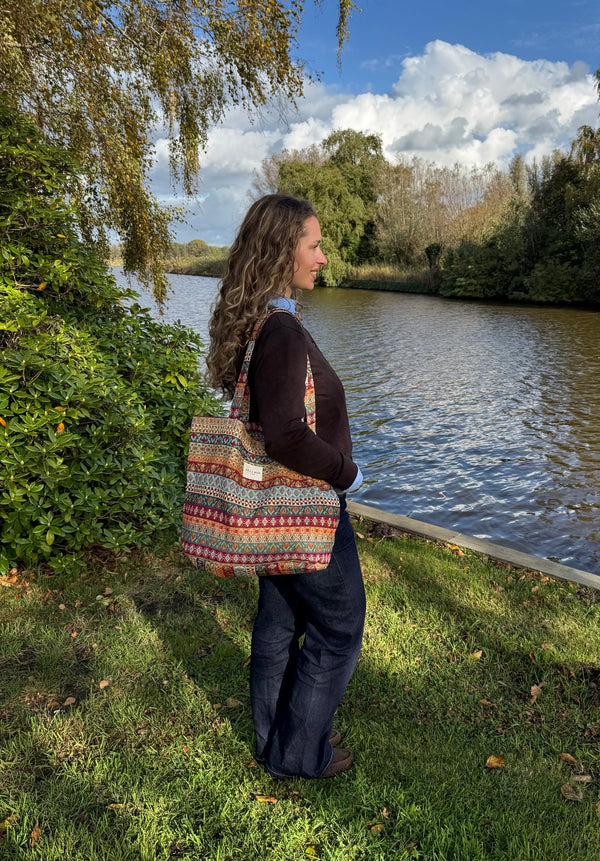 Dieser große Shopper von De La Mur Line ist aus einem dicken Jacquardstoff gefertigt, der ein farbenfrohes Streifenmuster aus geometrischen und floralen Motiven aufweist. Warme Farbtöne wie Rost, Türkis, Ocker und Creme wechseln sich ab.