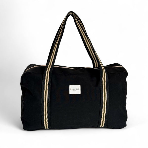 Diese robuste und geräumige Sporttasche aus der La Mur Line, auch Duffeltasche genannt, ist aus einem dicken, schwarzen, einfarbigen Stoff gefertigt.
