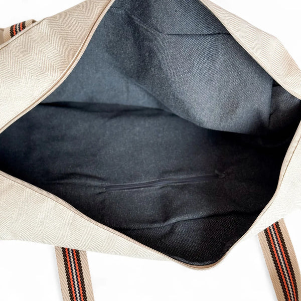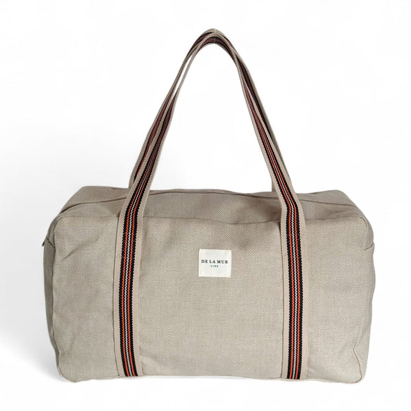 Diese robuste und geräumige Sporttasche aus der La Mur Line, auch bekannt als Reisetasche oder Seesack, ist aus einem dicken, einfarbigen beigen Stoff mit Fischgrätmuster gefertigt.