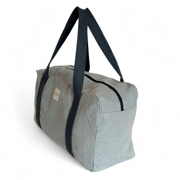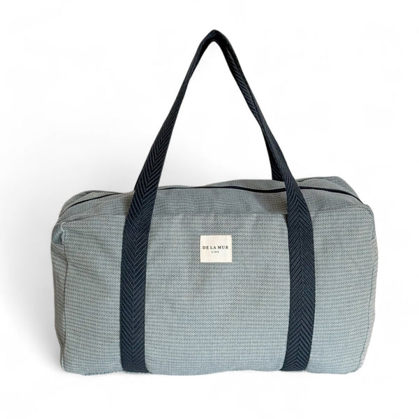 Diese robuste und geräumige Sporttasche aus der La Mur Line, auch Duffeltasche genannt, ist aus einem einfarbigen blaugrauen Stoff mit Fischgrätmuster gefertigt.