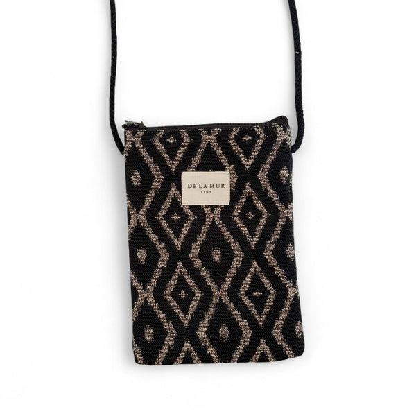 Dieses hübsche Handy-Etui von La Mur Line ist aus einem dicken Jacquardstoff mit einem beigen, grafischen Karomuster auf tiefschwarzem Hintergrund gefertigt.