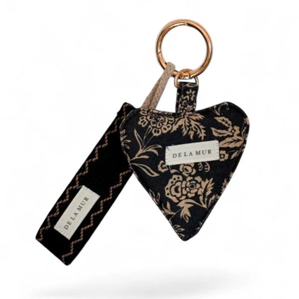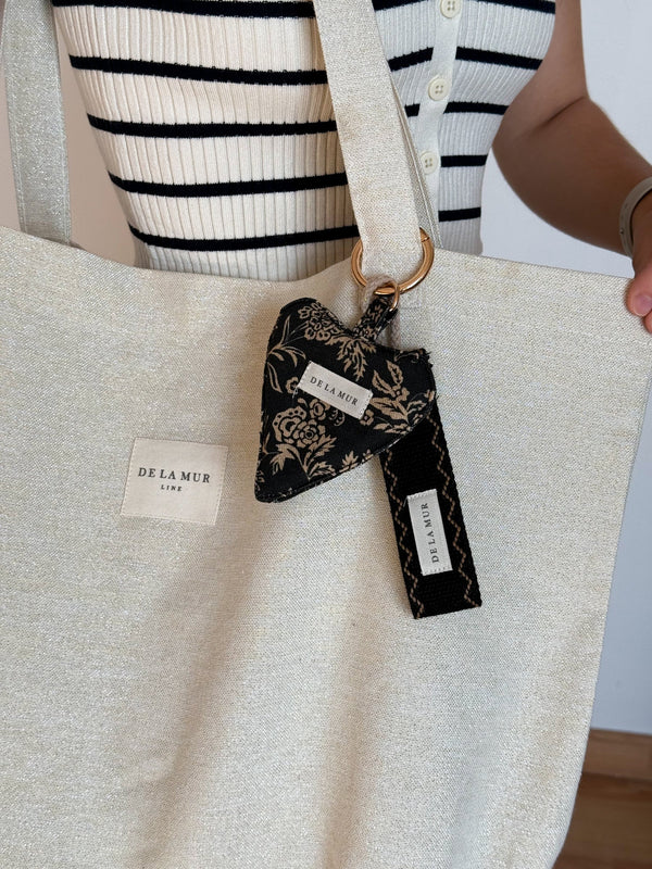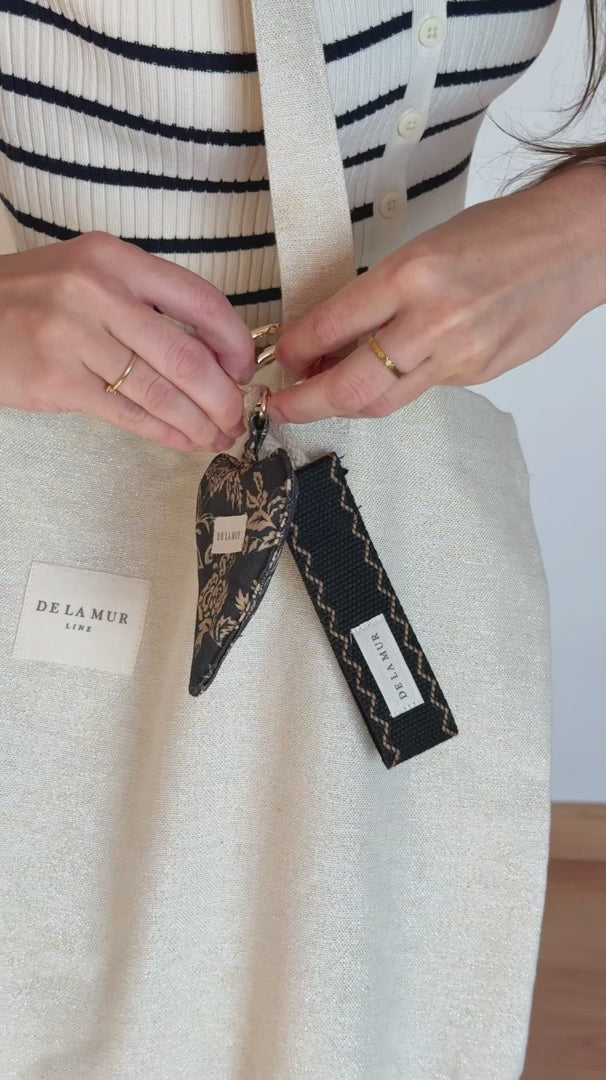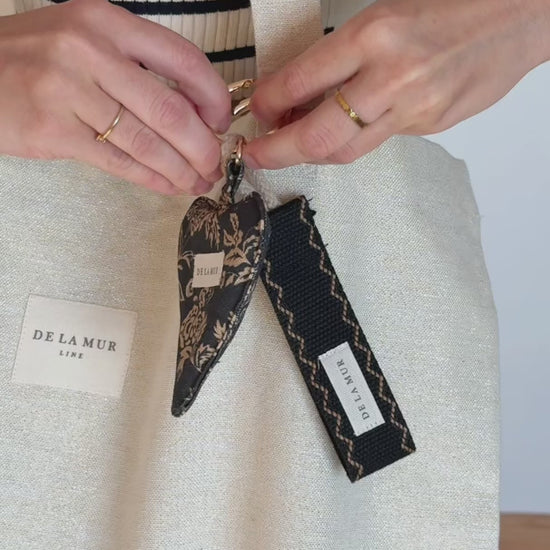 Deze stijlvolle tassenhanger, uitgevoerd in een elegant beige bloemenpatroon op een diepe zwarte ondergrond, is dé finishing touch voor elke tas. Elk item kan variëren in patroon, afhankelijk van hoe het is uitgesneden.