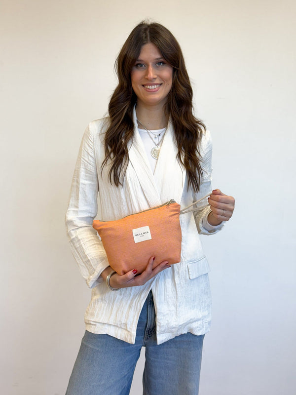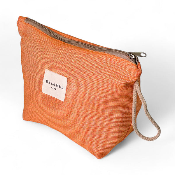 Deze Beauty Bag van de La Mur Line, ook wel toilettas of make-up tas genoemd, is uitgevoerd in een fijne oranje stof.