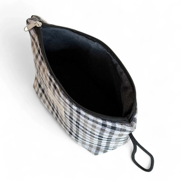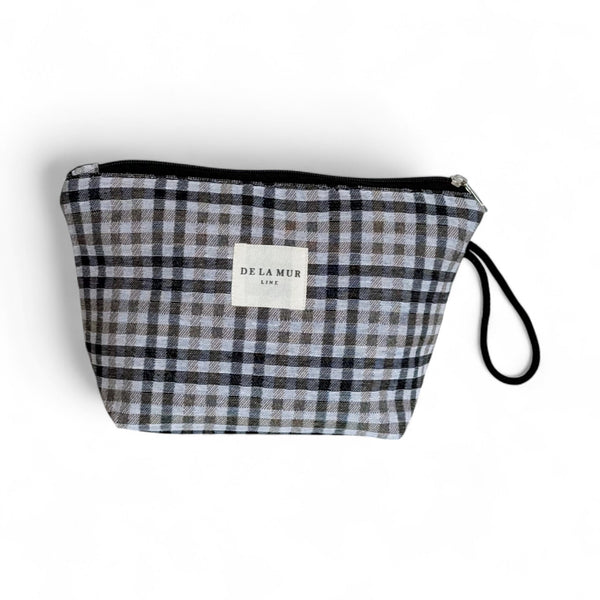 Deze Beauty Bag van de La Mur Line, ook wel toilettas of make-up tas genoemd, is uitgevoerd in een dikke jacquardstof met een ruitjespatroon in beige en zwarttinten. Elk item kan variëren in patroon, afhankelijk van hoe het is uitgesneden.