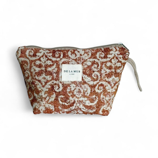 Deze Beauty Bag van de La Mur Line, ook wel toilettas of make-up tas genoemd, is uitgevoerd in een dikke jacquardstof met een beige ornamentmotief op een roestbruine achtergrond. De structuur en kleurcontrasten geven de stof een klassieke en barokke uitstraling. Elk item kan variëren in patroon, afhankelijk van hoe het is uitgesneden.