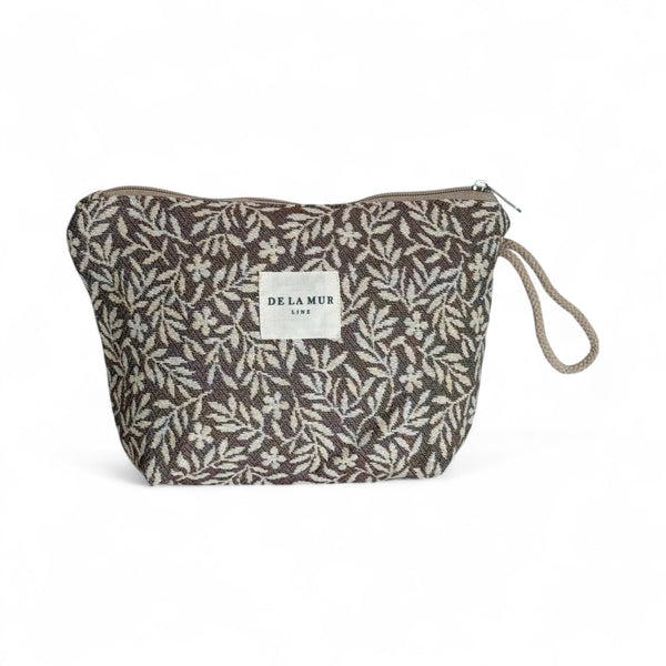 Deze Beauty Bag van de La Mur Line, ook wel toilettas of make-up tas genoemd, is uitgevoerd in een dikke jacquardstof met een bloemenprint in crèmekleur op een bruine achtergrond. Elk item kan variëren in patroon, afhankelijk van hoe het is uitgesneden.
