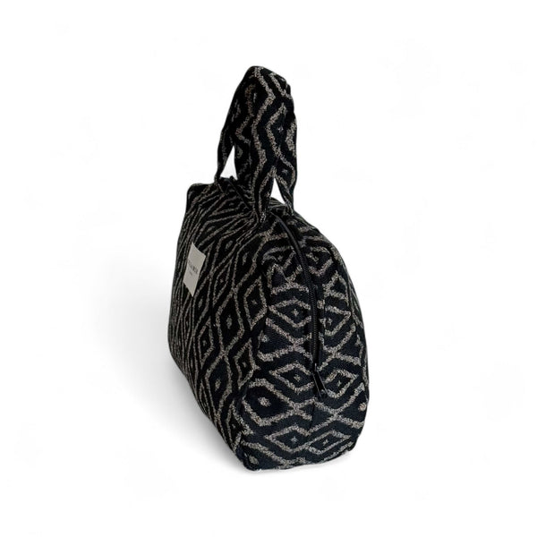 Deze extra grote Beauty Bag van de La Mur Line, ook wel toilettas of make-up tas genoemd, is uitgevoerd in een dikke jacquardstof met een beige, grafisch ruitpatroon op een diepzwarte achtergrond. Elk item kan variëren in patroon, afhankelijk van hoe het is uitgesneden.