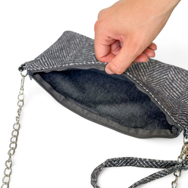Dit charmante handtasje van de La Mur Line, ook wel avondtasje genoemd, is gemaakt van een fijn stof met een donkergrijs visgraatpatroon.