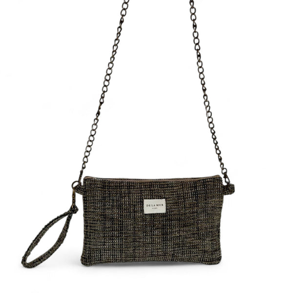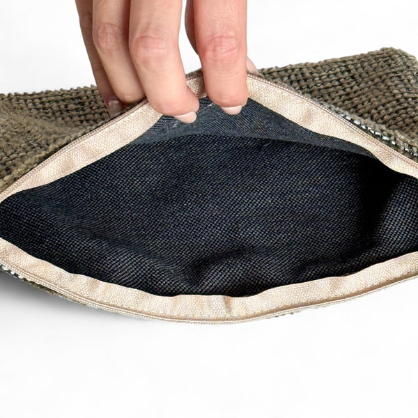 Dit charmante handtasje van de La Mur Line, ook wel avondtasje genoemd, is gemaakt van een dikke meubelstof met een grove, goed zichtbare structuur in kakitinten.