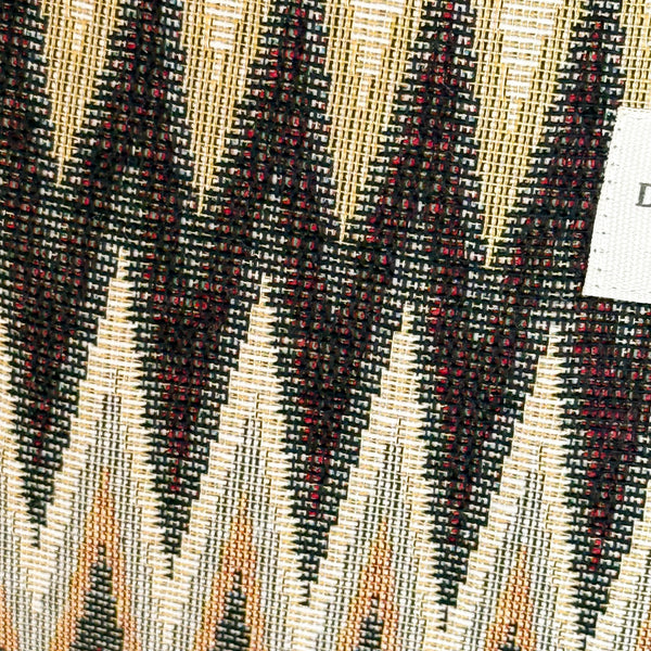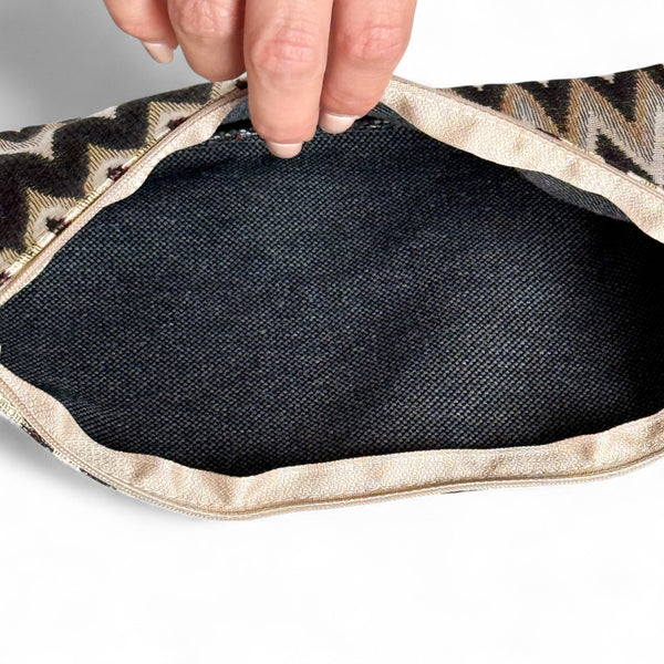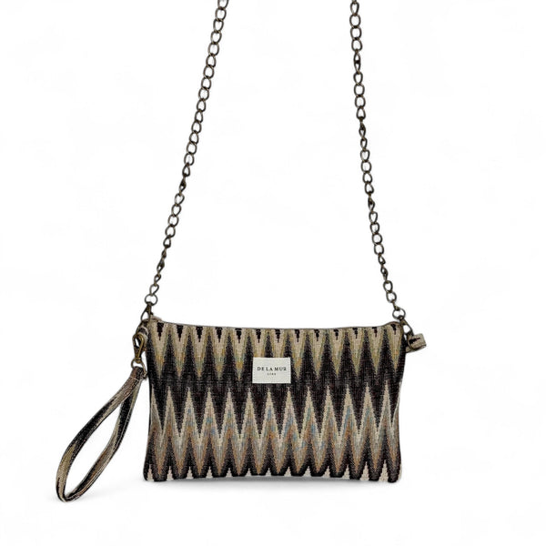 Dit charmante handtasje van de La Mur Line, ook wel avondtasje genoemd, is uitgevoerd in een dikke jacquardstof met een zigzagpatroon in aardse kleuren als beige, bruin, zand en zwart.