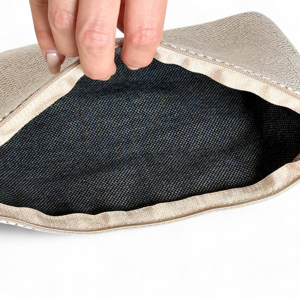 Dit charmante handtasje van de La Mur Line, ook wel avondtasje genoemd, is gemaakt van een dikke meubelstof in een beige-grijze tint.