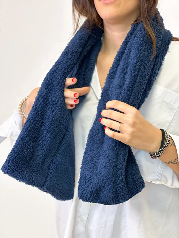 Deze doorsteeksjaal van de La Mur Line is uitgevoerd in een marineblauwe teddystof.