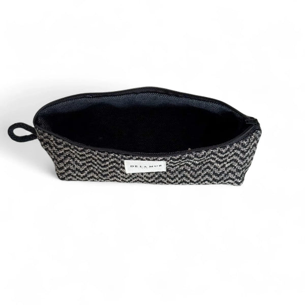 Deze elegante etui is uitgevoerd in een dikke jacquardstof met een zigzagpatroon in zwart en beige.