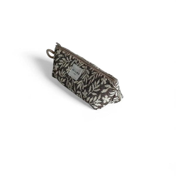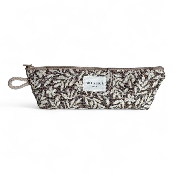Deze elegante etui is uitgevoerd in een dikke jacquardstof met een bloemenprint in crèmekleur op een bruine achtergrond. Elk item kan variëren in patroon, afhankelijk van hoe het is uitgesneden.