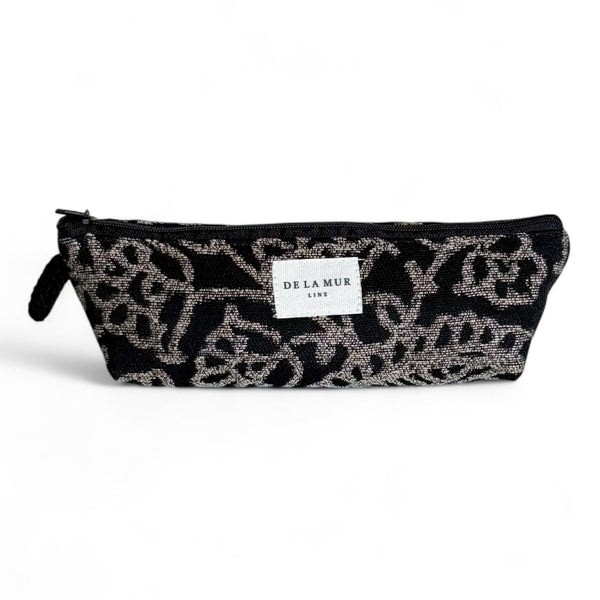 Deze elegante etui is uitgevoerd in een dikke jacquardstof met een sierlijk, grijs paisleypatroon op een diepzwarte achtergrond. Elk item kan variëren in patroon, afhankelijk van hoe het is uitgesneden.