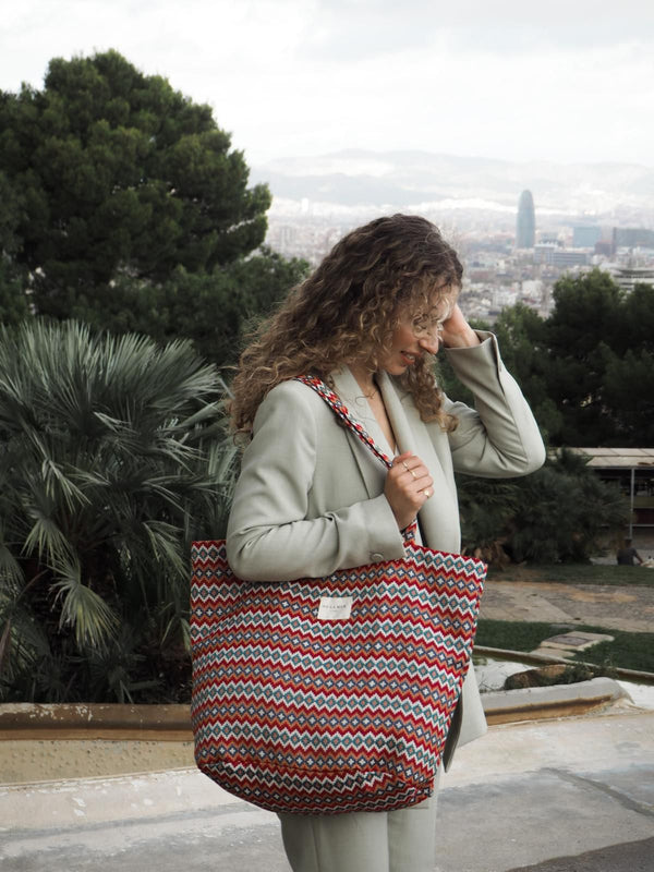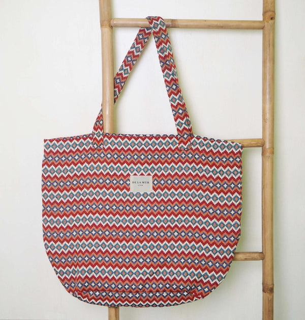Deze grote shopper van De La Mur Line is uitgevoerd in een dikke jacquardstof met een meerkleurige geometrische print.