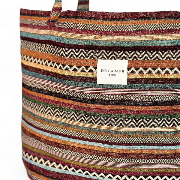 Deze grote shopper van De La Mur Line is uitgevoerd in een dikke jacquardstof met een meerkleurig horizontaal streeppatroon.
