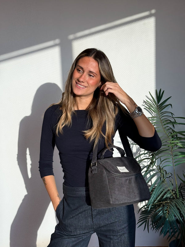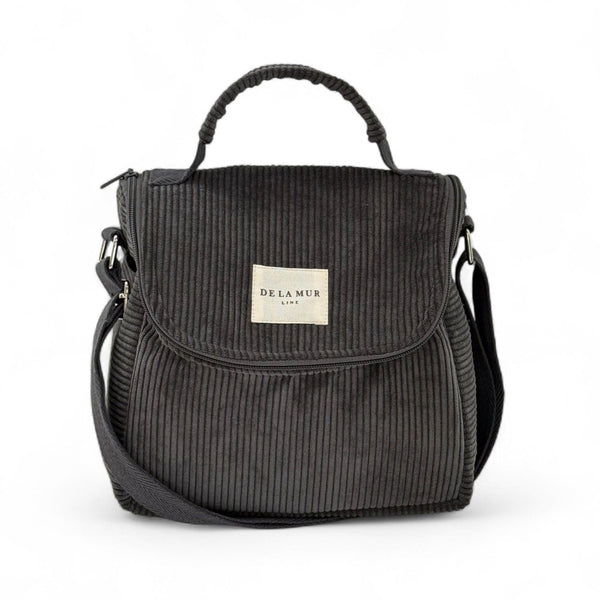 Deze stijlvolle lunchtas van De La Mur Line is uitgevoerd in een antraciete corduroy ribstof.