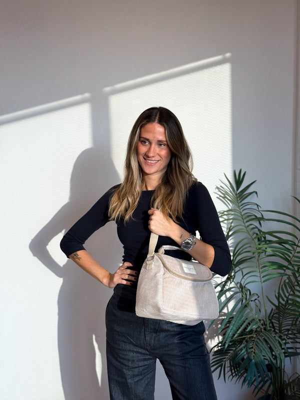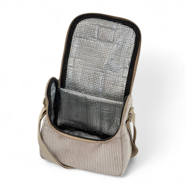 Deze stijlvolle lunchtas van De La Mur Line is uitgevoerd in een beige corduroy ribstof.