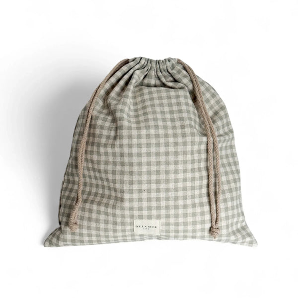 Deze lunchtas van De La Mur Line is gemaakt van een half-panama stof met een pastelgroene Vichy-ruitjesprint.