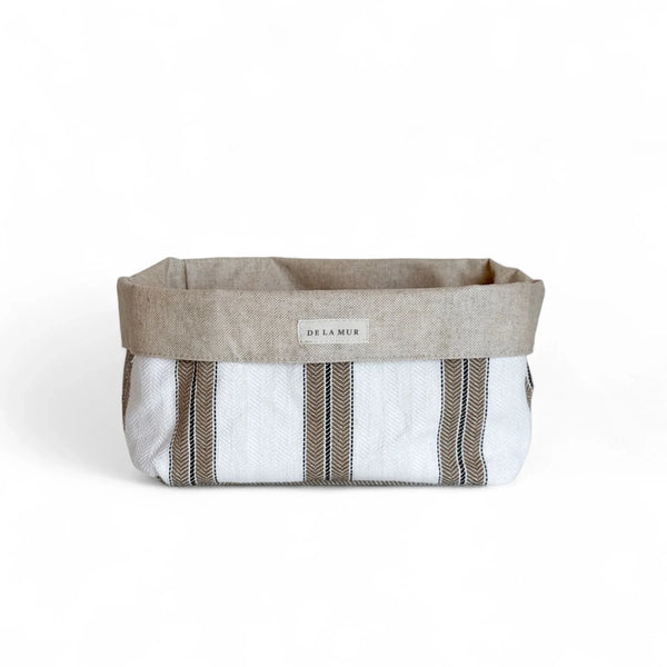 Dit opbergmandje van De La Mur Line is gemaakt van een stevige stof met een subtiel gestreept patroon in lichtbruin en wit. De binnenkant is afgewerkt met een gecoate laag die gemakkelijk schoon te maken is.